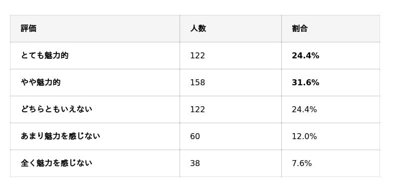 「とても魅力的」24.4%+「やや魅力的」31.6%=56.0%が肯定的評価。日常のスマホ利用がそのまま特典につながるサービス設計には過半数が好意的であり、付加価値型通信サービスへの潜在需要の大きさを示している。