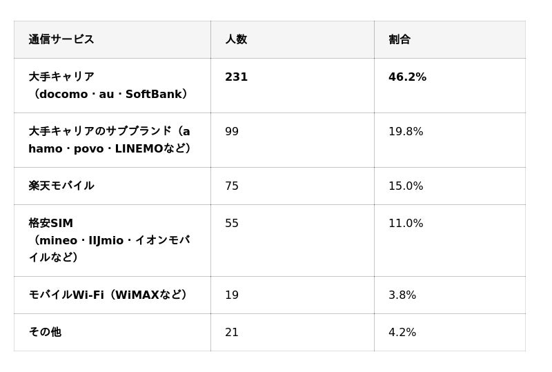 結論:大手キャリア利用者が46.2%で最多。最大の不満は「料金が高い」(38.0%)だが、「特典・付加価値が少ない」も20.2%と3位に入り、料金以外の価値を通信サービスに求める消費者が5人に1人存在する。