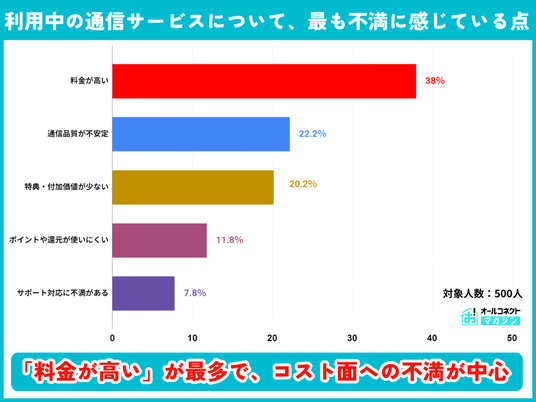 「料金が高い」が38.0%で最大の不満だが、注目すべきは「特典・付加価値が少ない」が20.2%で3位に入っている点だ。料金だけでなく付加価値を通信サービスに求める消費者が一定数存在することを示している。
