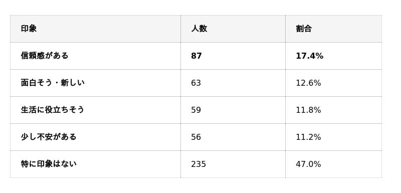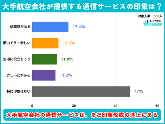 「特に印象はない」が47.0%で最多。一方、ポジティブな印象(信頼感17.4%+面白そう12.6%+生活に役立ちそう11.8%)は計41.8%を占めた。「信頼感がある」が最多であることは、航空会社が長年培ったブランド力が異業種への参入障壁を下げる要因になりうることを示唆している。