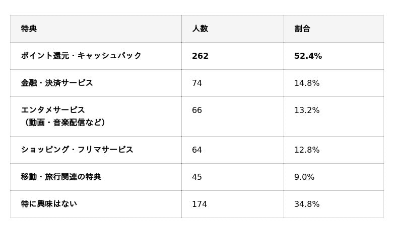 「ポイント還元・キャッシュバック」が52.4%で過半数を占めた。金融・エンタメ・ショッピングがそれぞれ13~15%で拮抗する一方、「移動・旅行関連の特典」は9.0%にとどまる。ただし「特に興味はない」も34.8%と高く、特典への関心が二極化している。