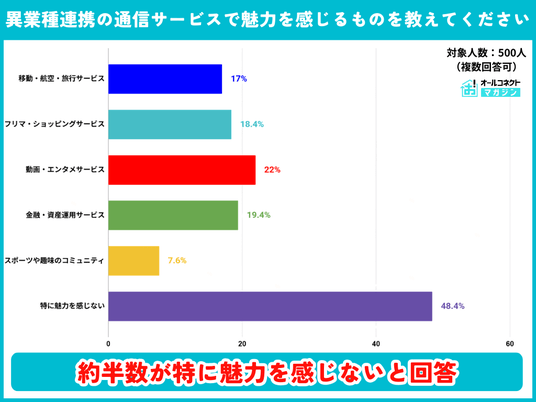 「特に魅力を感じない」が48.4%で最多であり、異業種連携型の通信サービスはまだ消費者に広く浸透していない。関心がある層では「動画・エンタメ」22.0%が最多で、「移動・航空・旅行」17.0%は4位だが、上位との差は5ポイント以内であり、認知が広がれば伸びる余地がある。
