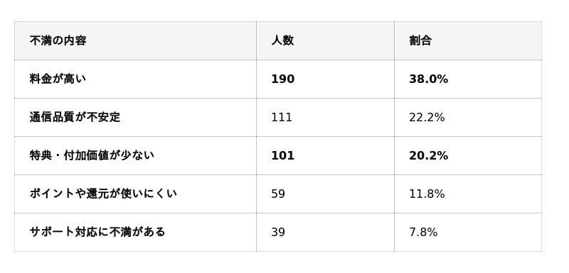 付加価値ニーズあり:「特典・付加価値が少ない」が不満の3位(20.2%)で、料金以外の価値を求める層が5人に1人存在