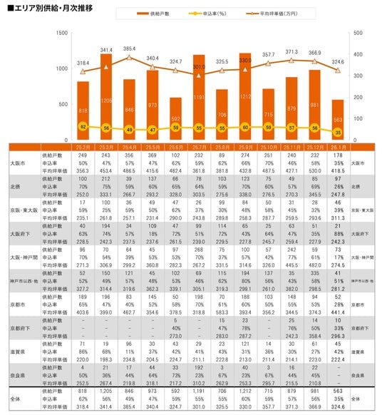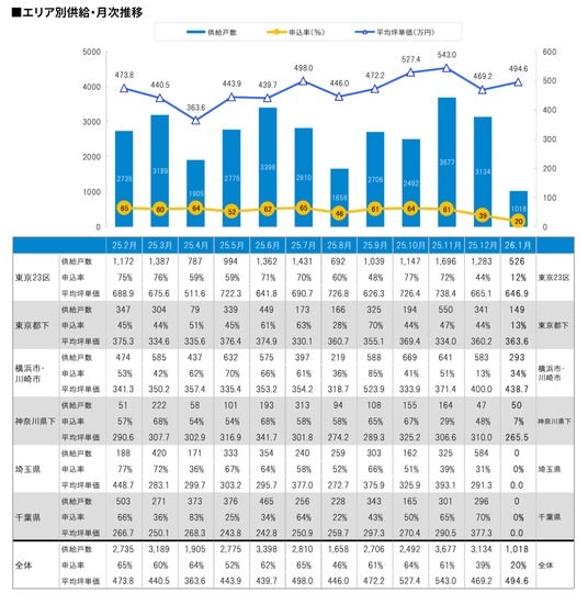 不動産ビッグデータとAI等のテクノロジーを活用し、不動産マーケティングプラットフォームを提供する株式会社マーキュリー(本社:東京都港区 代表取締役:陣 隆浩、証券コード5025、以下「当社」)は、独自調査による新築マンション動向を発表致します。今月は、2026年1月度分譲実績データです。