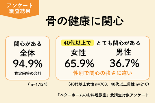 「骨の健康に関心」94.9%40代以上で「とても関心がある」女性 65.9%、男性 36.7%。性別で関心の強さに違い