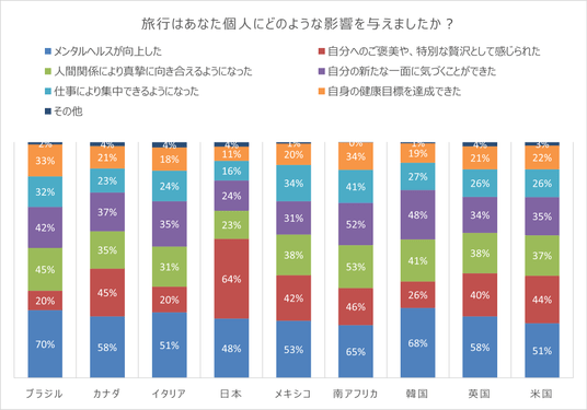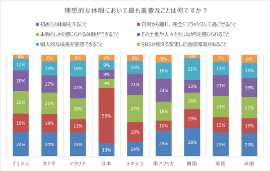 ・ 日本の旅行者の64%が、旅行を自分へのご褒美や特別な贅沢と捉え、理想的な休暇の在り方として、55%が日常から離れ、完全にリラックスして過ごせることを挙げています。(9カ国中最も多い。)