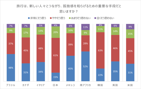 ・ 80%が、旅行は新しい人々とのつながりを生み、孤独感を和らげる助けになると回答。特に男性では82%と高い数値を示しています。(日本は「非常にそう思う」の割合が15%と9カ国中最も低い。)