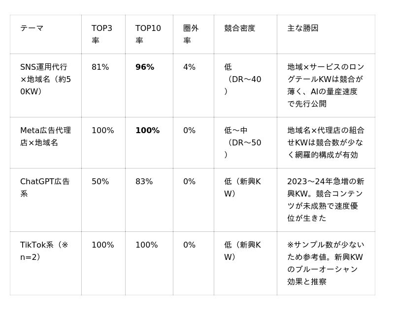 課題テーマの圏外化は主にKW選定・ドメイン権威性・領域特性に起因しており、AI記事固有の問題とは分離して考える必要があります。これらは人間ライター制作でも同様の結果になる可能性が高いと考えています。