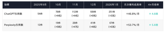 Google検索順位と並行して、ChatGPT・Perplexityなど生成AI検索への引用数も追跡しました。