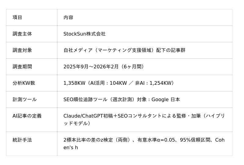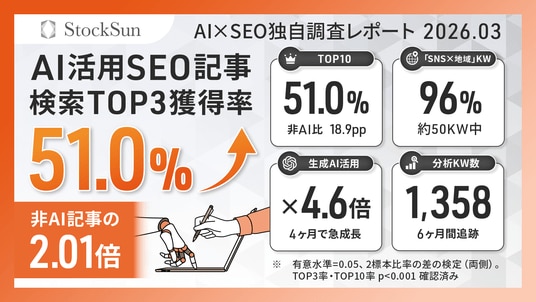 StockSun株式会社(本社:東京都新宿区、代表取締役:岩野 圭佑)は、自社オウンドメディア(マーケティング支援領域)のAI活用記事104KW・非AI記事1,254KW、計1,358キーワードのGoogle検索順位を6ヶ月間追跡した結果を公開します。