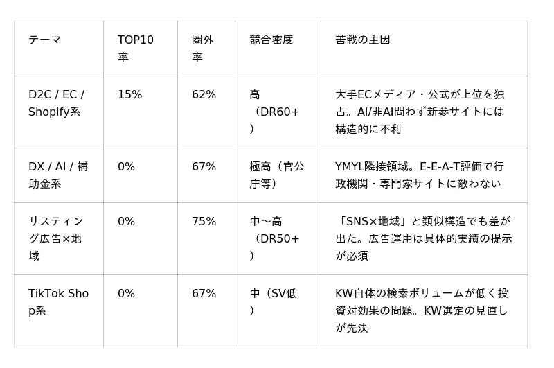 D2C・DX・リスティング広告系テーマの圏外化は、競合ドメインのDRが70~90超であること、YMYL隣接領域であること、官公庁・大手コンサルが上位を独占していることが主因です。これらは人間ライターで制作しても同様の結果になる可能性が高く、「AI記事だから負けた」ではなく「KW選定・ドメイン権威性の問題」として分離して考える必要があります。