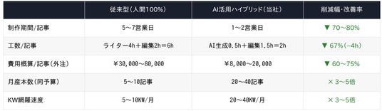 ※費用は社内工数の時給換算参考値。AI活用でも編集工数(E-E-A-T担保)の省略は不可。