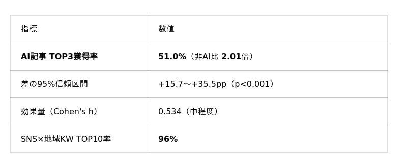 TOP3率(z=+5.63, p<0.001, h=0.534)・TOP10率(z=+3.70, p<0.001, h=0.387)は統計的に有意な差を確認。一方、TOP20率(z=+1.83)・圏外率(z=−0.50)は有意差なし(n.s.)。AI記事の優位性は「上位への集中」に特徴があり、中~下位圏での差は統計的に確認されていない。