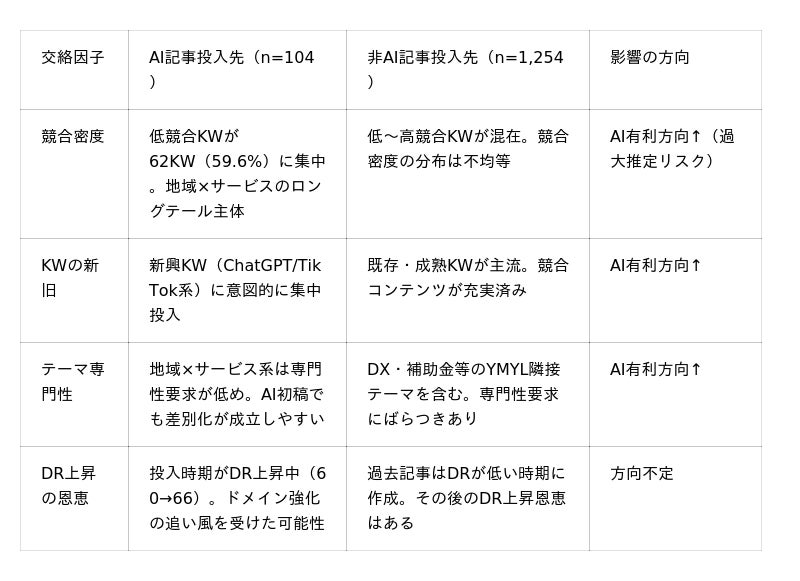 AI記事と非AI記事は投入先KWの属性が異なります。この差を考慮せずに比較すると、AI記事の効果を過大推定するリスクがあります。