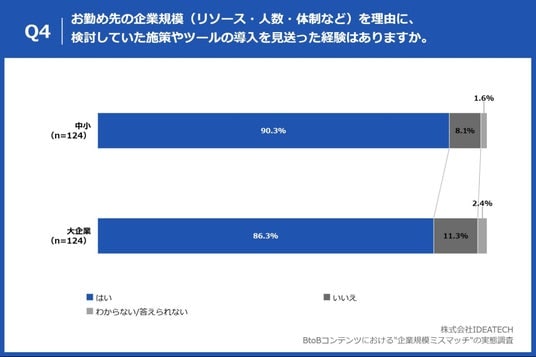 「Q4. お勤め先の企業規模(リソース・人数・体制など)を理由に、検討していた施策やツールの導入を見送った経験はありますか。」と質問したところ、中小(n=124)は「はい」が90.3%、「いいえ」が8.1%、大企業(n=124)は「はい」が86.3%、「いいえ」が11.3%と回答しました。