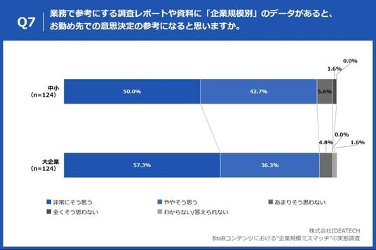 「Q7. 業務で参考にする調査レポートや資料に「企業規模別」のデータがあると、お勤め先での意思決定の参考になると思いますか。」と質問したところ、中小(n=124)は「非常にそう思う」が50.0%、「ややそう思う」が42.7%、大企業(n=124)は「非常にそう思う」が57.3%、「ややそう思う」が36.3%と回答しました。