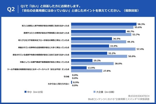 「Q2 過去1年間で、業務で利用する製品やサービスに関する資料を読んでいて、「自社の企業規模には合っていない」と感じ、読むのを途中でやめたことはありますか。」と質問したところ、中小(n=115)は「導入に必要な人員や体制が自社の規模に見合わなかった点」が58.3%で最多、大企業(n=108)は「掲載されている事例の企業規模が自社と大きく異なっていた点」が57.4%で最多が最多の結果になりました。