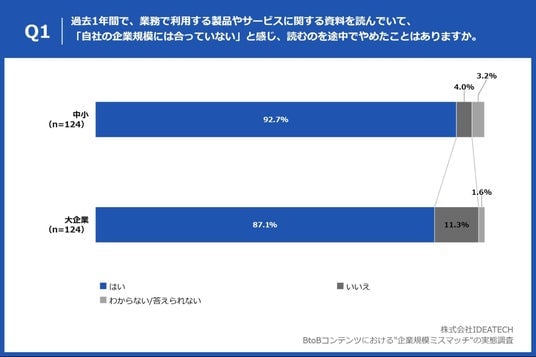「Q1. 過去1年間で、業務で利用する製品やサービスに関する資料を読んでいて、「自社の企業規模には合っていない」と感じ、読むのを途中でやめたことはありますか。」と質問したところ、中小(n=124)は「はい」が92.7%、「いいえ」が4.0%、大企業(n=124)は「はい」が87.1%、「いいえ」が11.3%と回答しました。