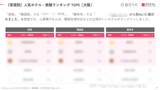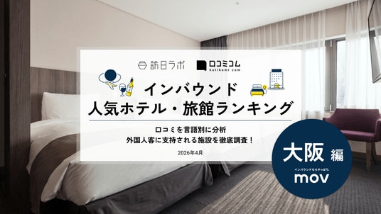 業界最大級のインバウンドビジネスメディア「訪日ラボ」及び 店舗向け集客一元化プラットフォーム「口コミコム」を運営する株式会社mov(代表取締役:渡邊 誠、本社:東京都渋谷区、以下mov)は、大阪府のホテル・旅館に寄せられた最新の口コミデータから、独自の『インバウンド人気ホテル・旅館ランキング』を発表しました。