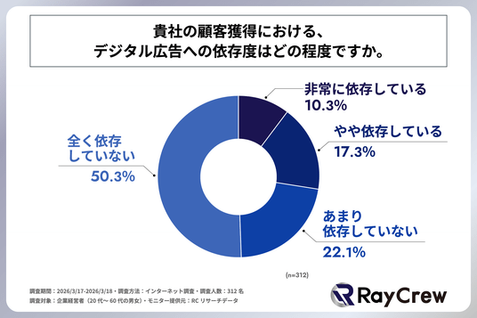 顧客獲得をデジタル広告に依存している企業の約6割が、デジタル広告への依存度に危機感を抱いている!株式会社レイクルーが「企業の顧客獲得チャネルに関する実態調査」を実施!