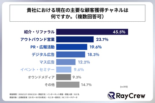 企業の45%以上において、現在の主要な顧客獲得チャネルは「紹介・リファラル」