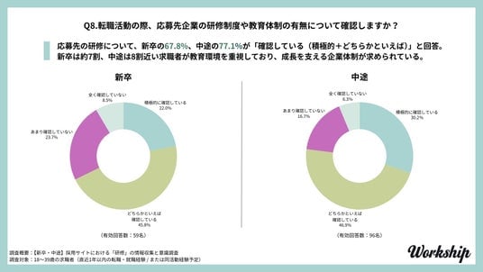 応募先企業の研修制度や教育体制の有無について確認するか尋ねたところ、新卒の67.8%、中途の77.1%が「確認している(積極的に+どちらかといえば)」と回答しました。