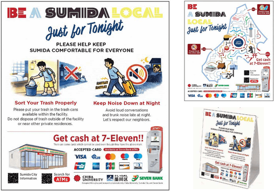・「Be a SUMIDA Local just for Tonight (今夜だけは、すみだの住民になろう)」をキャッチフレーズに、近隣トラブルになりやすい事例(ゴミ出しルール・夜間の騒音)について、外国人観光客にマナーの啓発を促すデザインを作成。