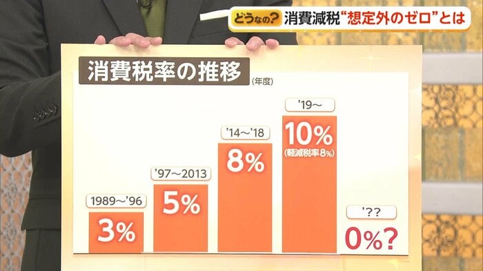 これまでの消費税率の推移を見てみると「3%→5%→8%→10%」と、これまで消費税をゼロにしたことがないことがわかる。8日の協議の参加者を取材すると、今のレジのシステムでは「税率をゼロにするのが難しい、『5%→3%』なら良いが…」という意見があがったという。