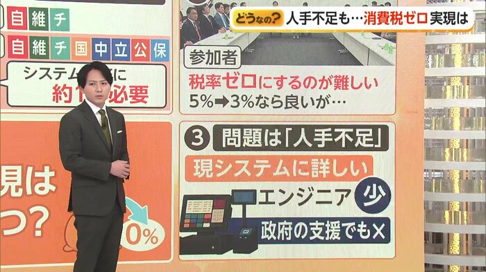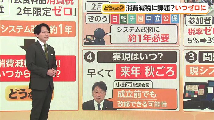 高市総理はこれまで、消費税ゼロを「今年度内」に実現させたいと言ってきた。ただ、システム改修に1年かかるのであれば、まず法律を改正して、そこからさらに改修作業となる。消費税ゼロが実現するのは、早くても2027年秋ごろにずれこみそうな見通しだ。