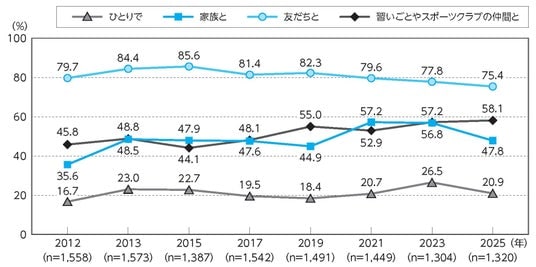 - 実施相手は「友だちと」が75.4%と最も高い。次いで「習いごとやスポーツクラブの仲間と」58.1%となり、2012年調査から12.3ポイント増加している。