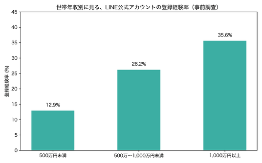 - 世帯年収別に見ると、LINE登録経験率は500万円未満で12.9%、500万~1,000万円未満で26.2%、1,000万円以上で35.6%
