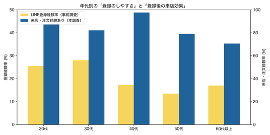 この結果から、飲食店LINEは、30代では登録の入口として機能しやすく、40代では登録後の再来店導線として特に強く機能している可能性がうかがえます。年代によって、重視すべきポイントが異なることが示唆されます。