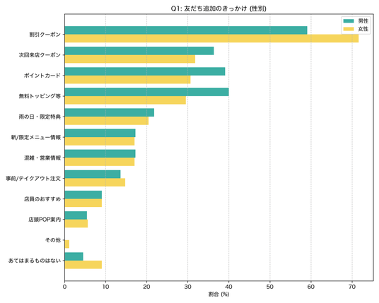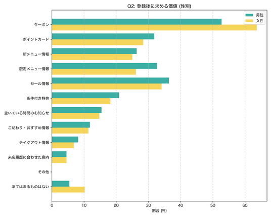 つまり、女性はクーポンなどの分かりやすい価値に反応しやすい一方で、男性は「登録している意味があるか」をよりシビアに見ている傾向がうかがえます。飲食店LINEでは、登録時の特典設計だけでなく、登録後もお得感や利便性を継続的に感じられる運用が重要だと考えられます。