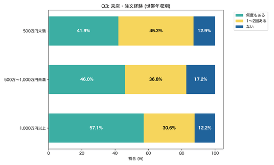 この結果から、高所得層ほどLINEを来店・注文のきっかけとして活用している一方で、内容の鮮度や変化に対してより厳しい目線を持っていることがうかがえます。効果が高い層に届けるほど、単なる一斉配信ではなく、意味のある配信設計が求められます。