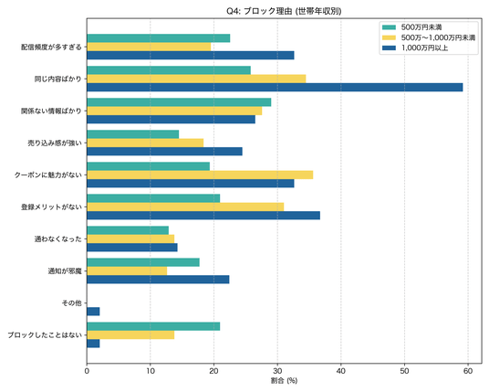 一方で、飲食店のLINE公式アカウントをブロックしたくなる理由として「同じような内容ばかり届く」を挙げた割合は、世帯年収1,000万円以上の層で59.2%にのぼり、500万円未満の層の25.8%を大きく上回りました。