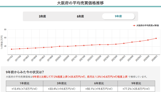 2.2026年3月時点で、大阪府全体の中古マンション平均平米単価は9年間で77.2%上昇。長期的な右肩上がりの成長トレンドを維持