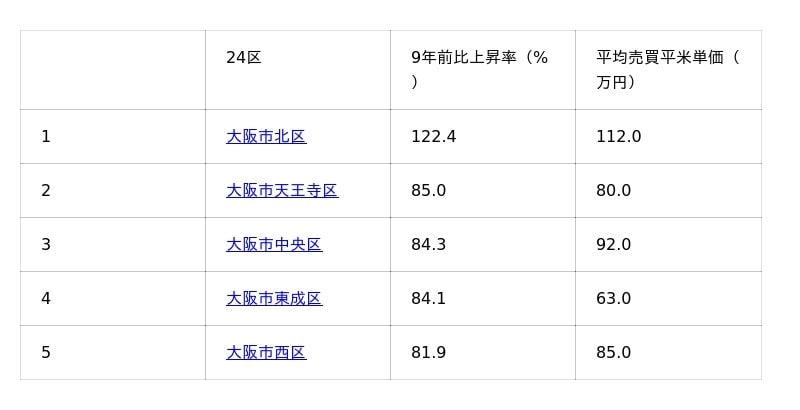 大阪市24区価格上昇率ランキング6位以降はすみかうるをご覧ください。