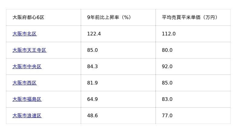 表1:大阪市都心6区の価格上昇率と平均売買平米単価(2026年3月現在)※価格上昇率順