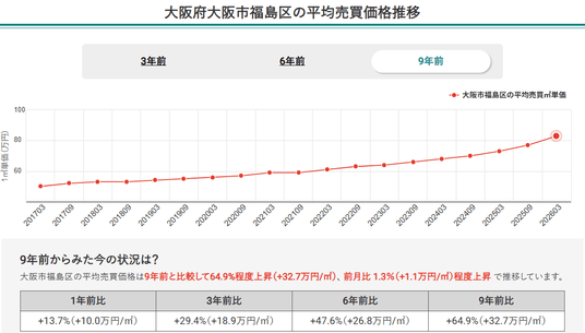 最新の調査結果によると、大阪市福島区の価格上昇率は過去9年間で64.9%に達し、市内24区中で第10位にランクインしました。
