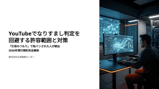 株式会社日本動画センター(本社:福岡県福岡市、代表取締役:山口直也)は、2026年のYouTube自動判定システムにおける「なりすまし」「引用」「オマージュ」の許容範囲と、BANを回避するための実践的対策をまとめた資料『YouTubeでなりすまし判定を回避する許容範囲と対策。「引用のつもり」で垢バンされた人が続出|2026年現行規約完全解剖』を無料公開しました。