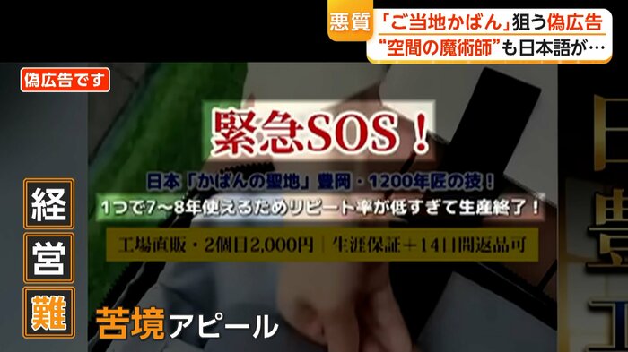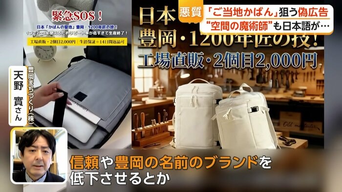 「超特価の在庫一掃セールを行うので、鞄を買って欲しい」と懇願している。しかし、地域ブランド「豊岡鞄」を販売するオフィシャルショップ運営元・豊岡まちづくり(株)の天野實さんは「これは偽広告だ!」と憤りを隠せない様子だ。