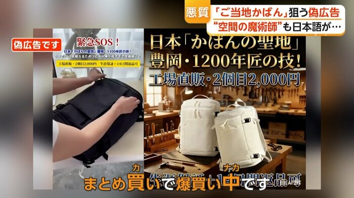 SNSで日本のご当地ブランドを悪用した偽広告の被害が相次いでいる。兵庫・豊岡市の鞄や岐阜・関市の包丁などが標的となっている。さらに、大阪・堺市の刃物店を名乗ったPR動画詐欺では、料理研究家が72万円をだまし取られるなど、手口は多様化している。