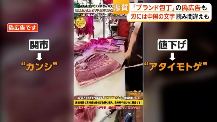 動画に書かれた「国際ナイフ金賞」は存在しない大会とみられ、包丁の刃には中国の文字があった。さらにナレーションでは「関市」を「カンシ」、「値下げ」を「アタイモトゲ」と読み間違えている。