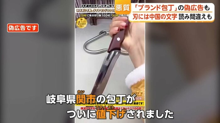 分厚い肉や紙をスパスパと切り、さらには水の入ったペットボトルも真っ二つ。切れ味鋭い包丁が「最安値」などと宣伝する広告動画。これは世界三大刃物産地の一つとされる岐阜・関市の包丁をうたう偽広告だ。