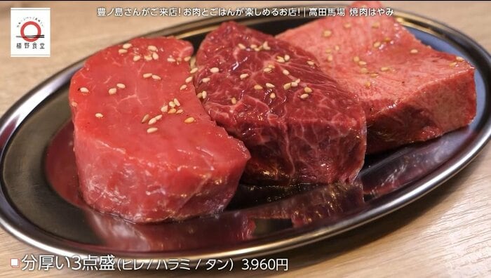 お肉とご飯をよりおいしく食べるために、「逃げのメニュー」の野菜を注文した植野さんが次にオーダーしたのは、自慢の「分厚い3点盛り(ヒレ・ハラミ・タン)」。