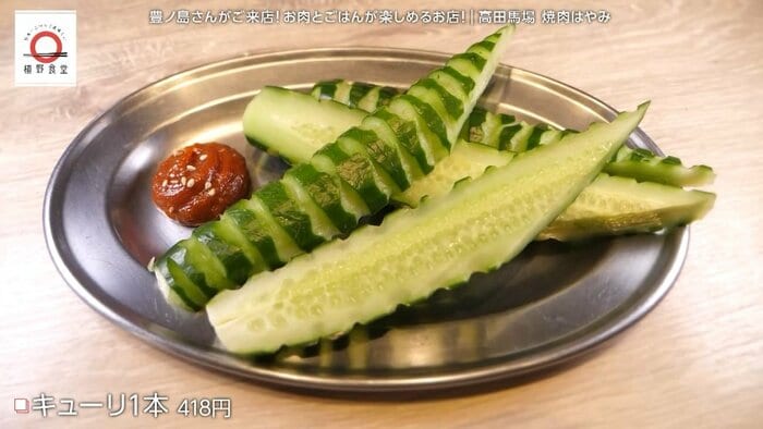 一品目は、生のきゅうりに特製味噌を添えた「キューリ1本」と「混ぜナムル」。すでに植野流の食べ方がはじまり、「肉を食べたいところではありますが…まず我慢。あっさりしたきゅうりをかじって、肉を食べたい欲求をあげてください」と植野さん。