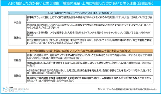 職場の先輩・上司と、AIのどちらに相談する方が良いと思うかについて、理由を自由回答で聞いた。