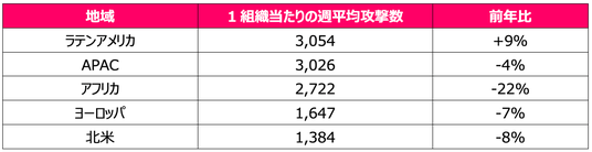 地域別の分析では、ラテンアメリカが最も多くの攻撃件数を記録し、1組織当たり週平均3,054件(前年比9%増)でした。2位はAPACで週平均3,026件(前年比4%減)、続くアフリカは週平均2,722件(前年比22%減)となりました。続いて、ヨーロッパでは1組織当たり週平均1,647件(前年比7%減)、北米では週平均1,384件(前年比8%減)の攻撃が確認されています。