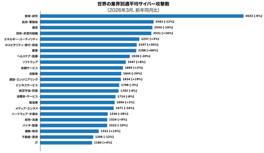 2026年3月も引き続き「教育・研究」分野が最も多く標的とされ、1組織当たり週平均4,632件(前年比6%減)のサイバー攻撃を受けました。続く2位は「政府・軍関係」分野で、週平均2,582件(前年比12%減)の攻撃を受け、「通信」業界が週平均2,554件(前年比10%減)で3位となりました。