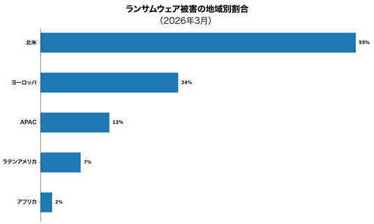 地域別では、北米が最も多くの被害を受け、ランサムウェア被害の55%を占めました。次いでヨーロッパが24%、APACが12%となっています。被害数では北米が抜きんでている一方、ヨーロッパでは顕著な増加が見られ、報告されたランサムウェア被害全体に占める割合は、2026年2月の17%から24%へと上昇しています。
